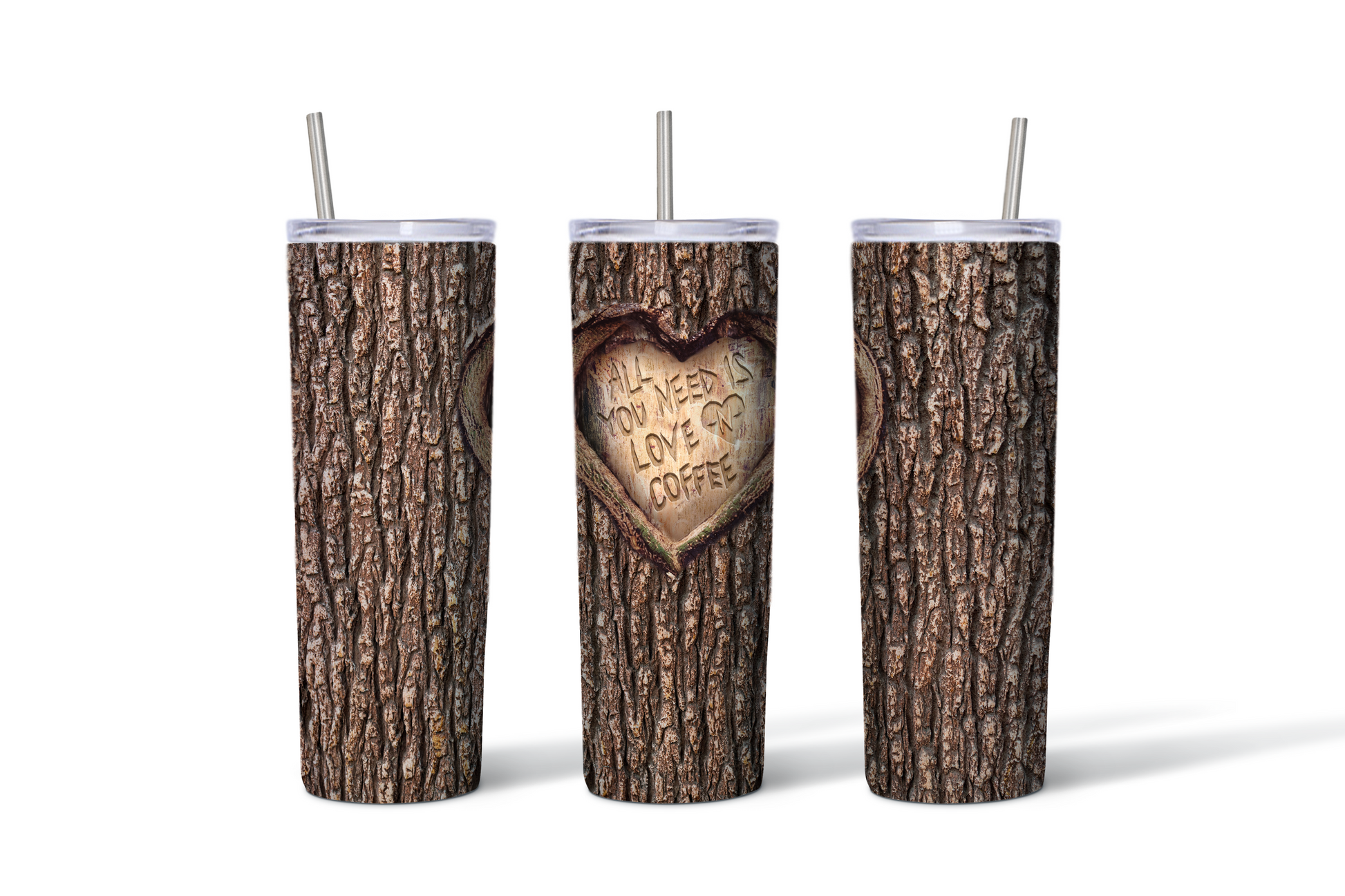 Bring cozy cabin vibes to your daily sip with our Love & Coffee Tree Carved Heart Tumbler. Featuring a realistic tree bark background and a carved heart design that reads “All You Need Is Love & Coffee,” this tumbler is the perfect blend of rustic charm and Valentine sweetness.