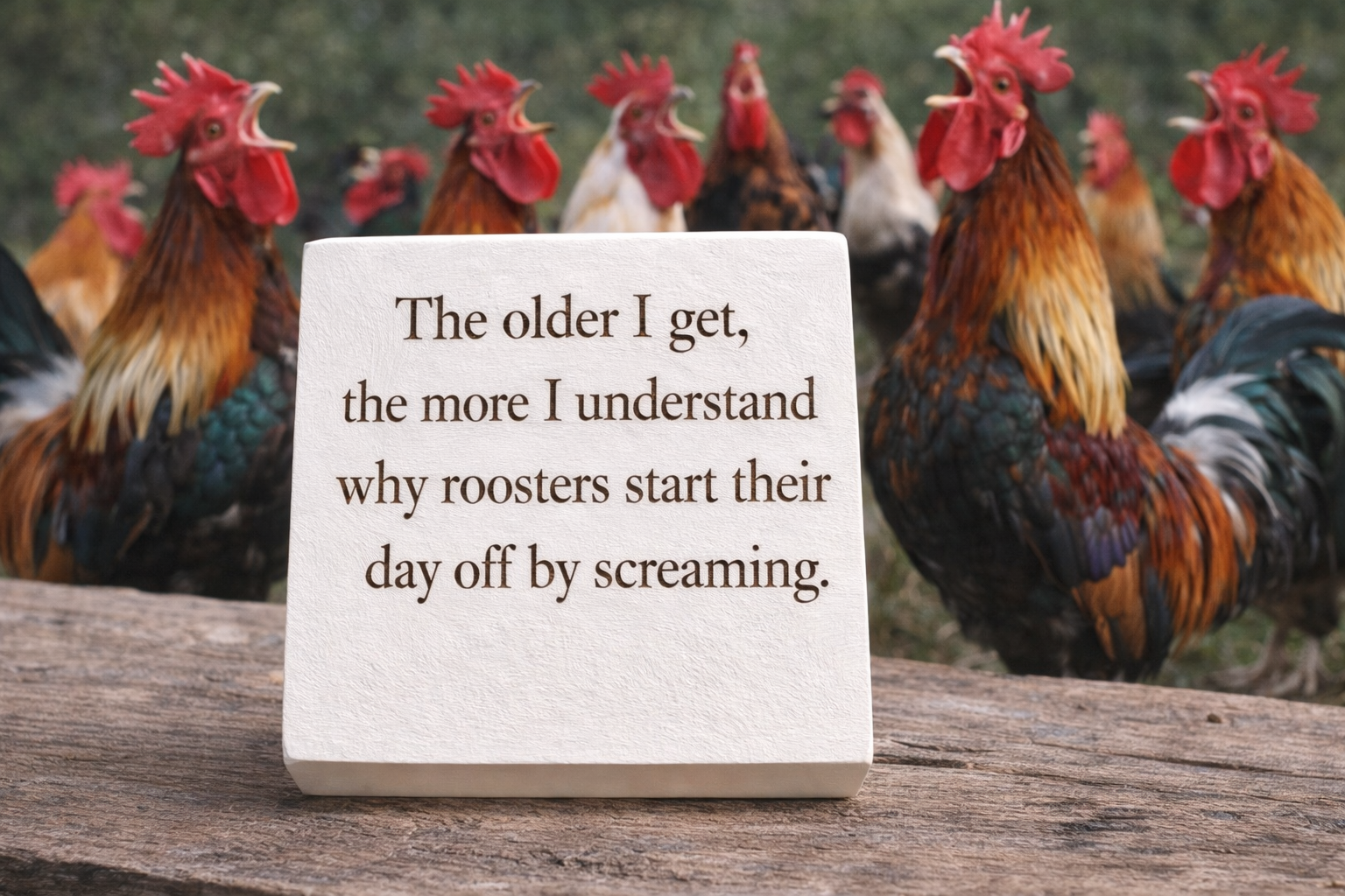 Roosters Reflections and Morning Thoughts- Funny Wood Block Signs – Snarky Shelf & Desk Decor